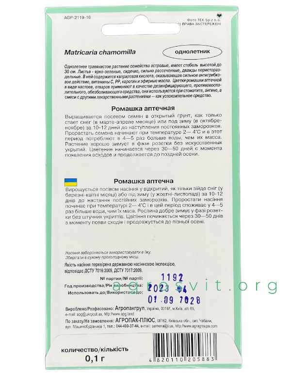 Однорічна трав'яниста рослина сімейства Айстрові, має стебло висотою до 30 см. Листя - яскраво-зелені, сидячі, сильно розсічені, двічі перистоокремі. У ній міститься каприлова кислота, що надає сильну антигрибкову дію, вітаміни С, РР, каротин і ефірні масла. Квітки ромашки аптечної у вигляді настоїв та відварів застосовують в якості дезинфікуючого, протизапального, знеболюючого засобу, вони використовуються при стоматиті, ангіні, в суміші з іншими лікарськими рослинами - як заспокійливий засіб.